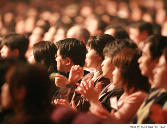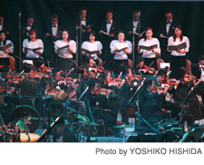 席まで走ってきたせいなのか、いよいよ始まる!と胸が躍っていた為なのか心臓がドキドキしている。そして出演者が一人二人と舞台に現れる。未だ胸の鼓動が収まらないうちに、[Unnatural City II (2002 Ver.)]が流れ始め【第一部】がスタート! 幻想的な雰囲気が漂いいくらか気分が落ち着いてくる。と、しばらくして舞台の左右から静かに西田社中のみなさんが最前列中央に並び始めた(おやっ!? 揃いの和服姿!……カッコイイ!!)。15名のメンバーが揃うや否や[百禽 Hyakkin]を唄い始め、静かな曲から一転パワフルな民謡コーラスが会場に響きわたる!(この曲は2005年に開催された【愛知万博】の『めざめの方舟』で使われた) 興奮のあまり私は一瞬我を忘れた(これだ! これが聴きたかったんだ!)。私と同じようにこの生歌を聴きたいがためにコンサートにこられた方も多かったのでは? 西田社中の方々も晴れの舞台でとても楽しそう。茂戸藤さんが太鼓を叩く。腕ふっと〜い! 力強く演奏する姿はまるで格闘家のようだ。と、ここで突然横から黒い人影が! 撮影用のカメラクルーがレールに乗って入ってきたのだった。右に左にと移動する。“働く男”な感じで興味が湧き、ついつい目がそちらに行ってしまうのであった(いかん、いかん。今日目の前で起きていることは次の機会があるかわからないのだ。コンサートに集中しないと!・笑)
