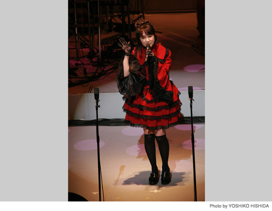 拍手の後、ゲストの児島由美さんが紅いドレス姿で登場し、川井さんから紹介をうける。聞けば川井さんとは長年のお知り合いとのことだ。思い出話で盛り上がったりしてなんだかほんわかムード。そして[御先祖様万々歳!]を熱唱。